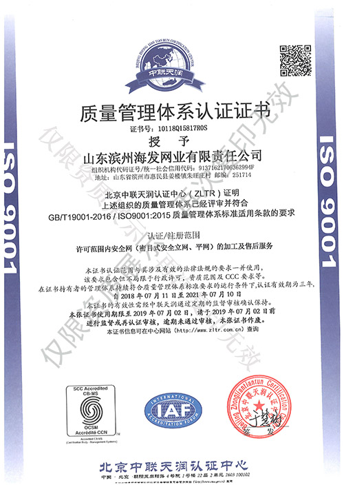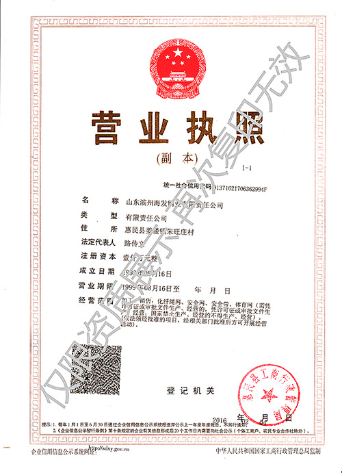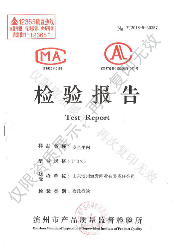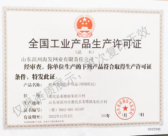海发网业是安全平网、密目式安全立网专业生产国家甲级单位。安全网、单背安全带、锦纶网、网绳等有国家安全生产监督局和国家质量技术监督局颁发的特种劳动防护用品安全生产许可证,是国家建设安全协会认证准用产品,是国家特种劳动防护用品定点生产企业之一。全国质量服务信誉AAA级示范单位,连续六年获得“国家质量监测合格产品”证书,连续七年获得“省市定期监督检验合格产品”证书。